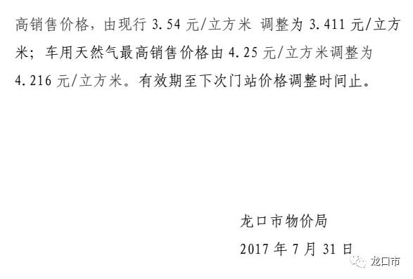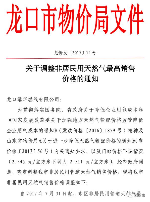 公告 | 关于调整龙口市非居民用天然气最高销售价格的通知