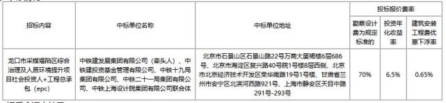 12月21日,山东省龙口市采煤塌陷区综合治理及人居环境提升项目社会投资人+工程总承包(epc)中标公告发布,中标人为中铁建发展集团有限公司(牵头人)、中铁建投资基金管理有限公司、中铁十九局集团有限公司、中铁二十一局集团有限公司、中铁上海设计院集团有限公司联合体,项目总投资约60.55亿元。